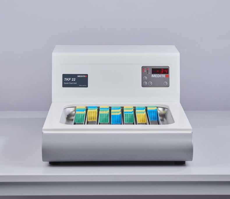 Agregat do głębokiego chłodzenia TKF 22 jest używany w laboratorium histologicznym do szybkiego zamrażania bloków parafinowych. W bezszwowej, głęboko tłoczonej tacy chłodzącej, wykonanej z łatwej do czyszczenia stali nierdzewnej, mieści się do 180 bloków parafinowych. Wydajna jednostka chłodząca zapewnia maksymalną temperaturę chłodzenia -35°C (w zależności od temperatury otoczenia), która jest osiągana w około. 10 minut.