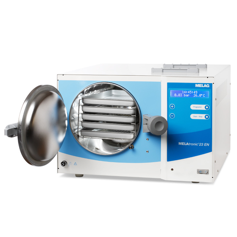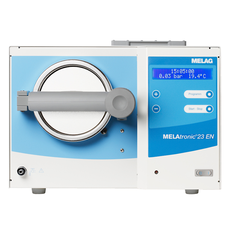 Wysokiej jakości komora ze stali nierdzewnej, funkcje ochronne i długotrwałe części zapewniają niezawodność przez wiele lat. MELAtronic 23 EN jest zbudowany dla większej placówki. Można w nim sterylizować wsady do 4 kg na 5 tacach lub maks. 400g tekstyliów.