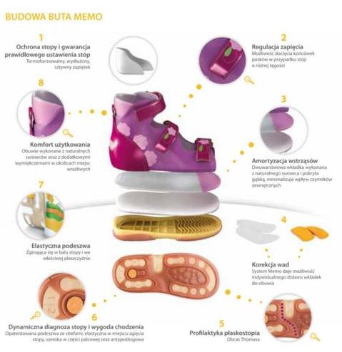 dbamy o prawidłowy rozwój stóp naszych dzieci. Memo to najwyższej jakości obuwie dla dzieci, wykonane w klasycznym stylu z naturalnych materiałów przyjaznych stopie dziecka. Unikatową funkcję diagnostyczną zapewnia system monitoringu w podeszwie Memo. Wypracowana przez lata konstrukcja i technologia montażu butów Memo zyskała uznanie specjalistów jako skuteczna metoda profilaktyki i leczenia najczęstszych wad postawy.