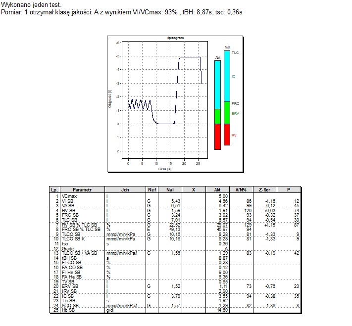 o TLCO SB (DLCO SB) – całkowita pojemność dyfuzyjna płuc,