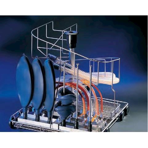 wtryskiwacza oraz układane na spiralnej podstawie. Podczas mycia i dezynfekcji następuje wytworzenie płynacego w górę słupa wody, czego wynikiem jest optymalna dezynfekcja węży anestezjologicznych. Po zakończeniu mycia i dezynfekcji roztwór myjacy wypływa całkowicie z węży anestezjologicznych. Włączające się następnie suszenie umożliwia odpowiednie przygotowanie przyborów. Wózki uniwersalne E 436/2 umożliwiaja bezpieczna dezynfekcję chemiczna.
