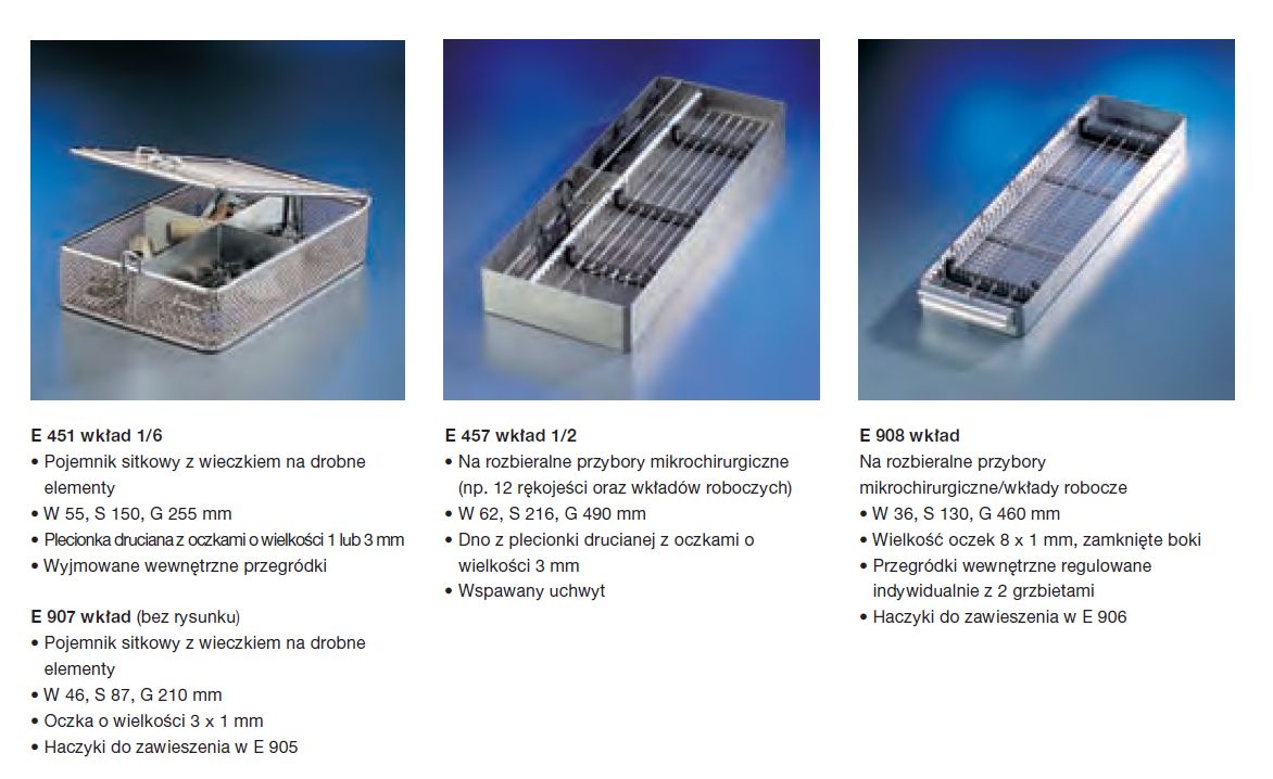 W celu dezynfekcji przyborów mikrochirurgicznych można wyposażyć E 450/1 na poziomie górnym w do 40 różnych dysz wtryskujacych, tulei płuczacych i złaczy. Sortowanie i rozmieszczenie bywaja różne i można je dostosowywać do potrzeb indywidualnych. Na poziomie dolnym można umieszczać pojemnik i sitka E 457, E 460 i E 451. Pojemnik – sitko E 451 na drobne elementy jak zawory tłoczkowe, połaczenia gwintowane, uszczelki itp. stanowi seryjny element wyposażenia. Możliwe jest mechaniczne odkażanie elementów optycznych marek Hopkins (firma Storz) oraz Lumina (firma Wolf) przy pomocy programu DESIN vario TD w automatach ze sterowaniem MCU przy bezpiecznym ułożeniu w E450/1.