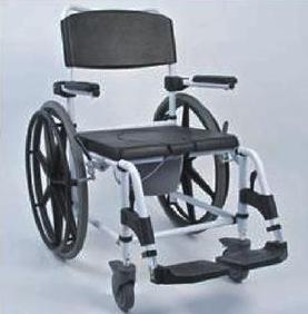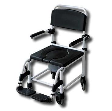Wózek prysznicowo-toaletowy z wyściełanym oparciem i siedziskiem. Wyposażony w podłokietniki oraz podnóżki odchylane ułatwiające wsiadanie do wózka. Wyposażone w tylne małe lub duże koła.