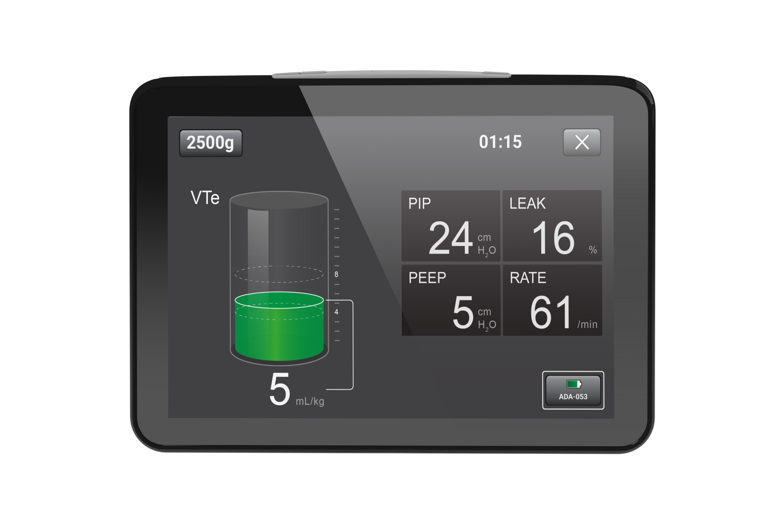 • Wyróżnione kolorami parametry dotyczące wartości VTe wspomagają proces wentylacji w docelowym zakresie objętości