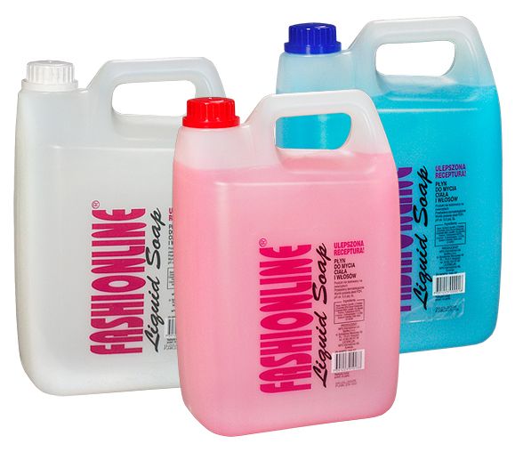 Mydło w płynie (białe, różowe lub niebieskie do mycia ciała i włosów), przeznaczone do wszystkich rodzajów skóry, pojemność 5 l.