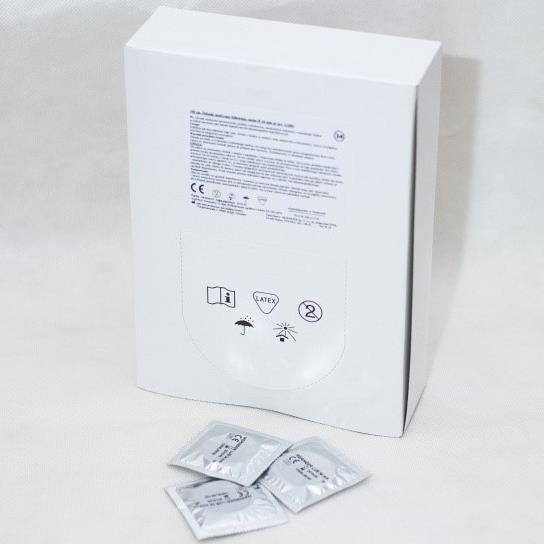 - Osłonki wykonane z naturalnego lateksu, lekko pudrowane, pakowane pojedynczo w aluminiowy blister.