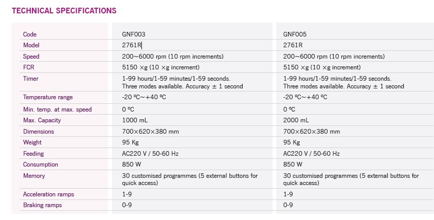 Duża wszechstronność dzięki szerokiej gamie dostępnych rotorów, zarówno odchylanych, jak i kątowych, wraz z możliwością stosowania probówek o pojemności od 5 ml do 250 ml (lub 500 ml z GNF005).