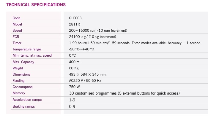 Ta wysokoobrotowa wirówka z chłodzeniem o dużej pojemności (do 400 ml) ma szeroką gamę rotorów łączących zaawansowane funkcje, wszechstronność i prostotę. Może obsługiwać wirówki 0,2 mL, 0,5 mL, 1,5/2 mL, 5 mL, 10 mL, 15 mL, 50 mL, 100 mL i rurki kapilarne z maksymalnym RCF 24100 xg w zakresie temperatur -20°C~+40°C z funkcją szybkiego wstępnego chłodzenia.