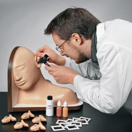 Symulator badania ucha pozwala na ćwiczenie badania ludzkiego ucha. Specjalny odlew, symulujący zewnętrzny i wewnętrzny wygląd fizyczny oraz wymiary, zawiera łatwo wymienialne modele uszu. Rzeczywisty rozmiar i kolorowe nadruki na błonie bębenkowej zapewniają bardzo naturalny wygląd. Naturalna, elastyczna tekstura ucha wymaga takich samych czynności jak podczas użycia wziernika do ucha u żywego pacjenta. Realistyczne ćwiczenia z czyszczenia ucha są możliwe dzięki dwóm tubkom syntetycznej woskowiny dołączonej do symulatora. Dodatkowy zestaw czterech uszu jest przeznaczony do zaawansowanych ćwiczeń z zakresu pielęgniarstwa i nauki.