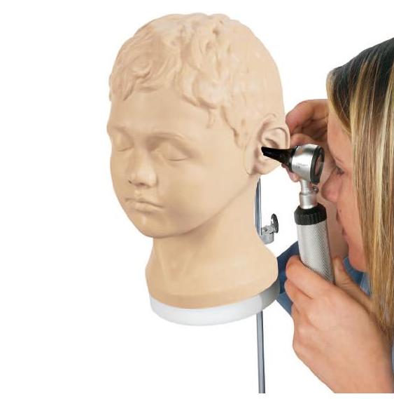 Fantom do diagnostyki chorób ucha. Za pomocą kolorowych wkładów zdjęciowych można zobaczyć: śluzowe zapalenie ucha środkowego, surowicze zapalenie ucha środkowego z banieczkami powietrza, przewlekłe zapalenie ucha środkowego z małą i dużą perforacją błony bębenkowej, perlak ucha środkowego, atelectatic, tympanic.