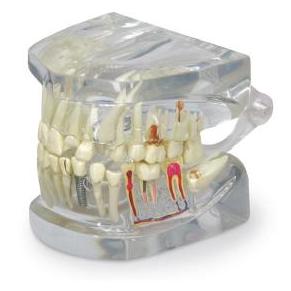 Pełnowymiarowa szczęka umożliwia przeglądanie korzeni. Zdrowa strona pokazuje normalne uzębienie i zgryz. Druga strona pokazuje wiele patologii.