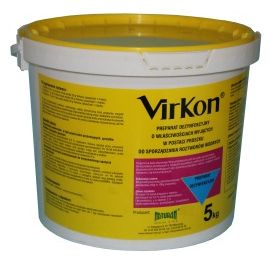 VIRKON jest proszkowym, wieloskładnikowym preparatem. Zawiera mieszaninę związków powierzchniowo czynnych, substancji utleniających, kwasów organicznych, nieorgnicznych układów buforujących oraz dodatek substancji stabilizujących. Substancją czynną jest bis (siarczan) bis (nadtle-nomonosiarczan) pentapotasu. W roztworze użytkowym ma barwę różową, charakteryzuje się właściwościami pieniącymi. ZAKRES STOSOWANIA. VIRKON jest stosowany wszędzie tam, gdzie istnieje konieczność profilaktyki lub opanowania szerzenia się zatruć bakteryjnych, grzybiczych oraz wirusowych. Ze względu na szeroki zakres działania biobójczego w stosunku do drobnoustrojów chorobotwórczych i powodujących psucie żywności preparat jest dopuszczony do dezynfekcji powierzchni kontaktujących się z żywnością oraz do dezynfekcji jaj przeznaczonych do bezpośredniego spożycia i przetwórstwa. VIRKON posiada właściwośi dezynfe-kująco-myjące i zalecany jest do dezynfekcji powierzchni, sprzętów, maszyn i urządzeń wykonanych z metali, szkła, tworzyw sztucznych i gumy. Szczególnie jest zalecany w przemyśle spożywczym, handlu, gastronomii, zakładach zbiorowego żywienia oraz placówkach użyteczności publicznej do dezynfekcji: • linii technologicznych, sprzętu i urządzeń produkcyjnych; • urządzeń chłodniczych; • blatów kuchennych, sztućców, talerzy i naczyń; • powierzchni podłóg i ścian; • zgarniaków, szczotek, mioteł, pojemników na odpady; • urządzeń sanitarnych; • środków transportu. VIRKON używany jest w zamkniętych i otwartych placówkach służby zdrowia (szpitalach, przychodniach, sanatoriach), stacjach krwiodawstwa oraz przez producentów szczepionek i przemysł farmaceutyczny. VIRKON stosowany jest także w rolnictwie. Pojemność: 200g, 5 kg.