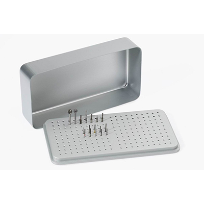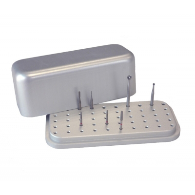 Aluminiowa podstawka na wiertła. Posiada zdejmowaną przykrywkę. Nadaje się do sterylizacji w autoklawach.