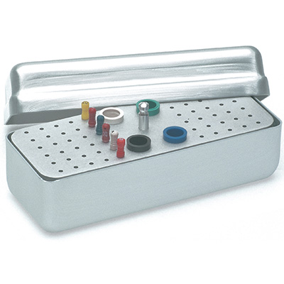 Aluminiowy endoboks z 60 otworami na instrumenty endo. Endoboks posiada dodatkowo 4 pojemniki na gutaperkę. Nadaje się do sterylizacji w autoklawach.