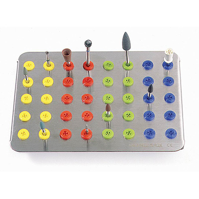 Stalowa podstawka na 40 wierteł. Posiada otwory z silikonowymi wkładkami na wiertła. Nadaje się do myjek ultradźwiękowych, do sterylizacji w autoklawach i do myjni – dezynfektorów.