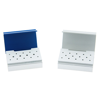 Aluminiowy stojak na wiertła. Stojak z odchylaną przykrywką, którą można całkowicie usunąć. Nadaje się do sterylizacji w autoklawach.