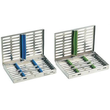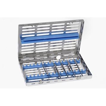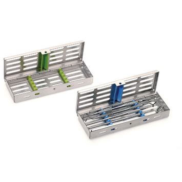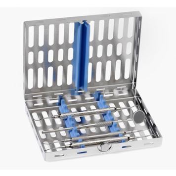 Kasetka posiada silikonowe podkładki – uchwyty na instrumenty i przykrywkę. Nadaje się do myjek ultradźwiękowych, do sterylizacji w autoklawach i do myjni – dezynfektorów.