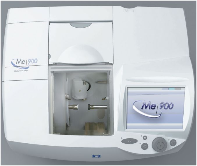 Wielofunkcyjny automat szlifierski Me 900. Cechy urządzenia: Automatyczne wiercenie i rowkowanie 3D. Fazowanie i polerowanie powierzchni fazowanej. Tryby obróbki dla każdego rodzaju soczewki. Zaawansowany edytor kształtu. Przyjazny dla użytkownika, dotykowy ekran LCD. Funkcja wiercenia 3D (pochylania otworów) umożliwia tworzenie otworów o rozmaitych kształtach, takich jak żłobienie, nacięcia, otwory z pogłębieniem stożkowym i otwory biżuteryjne. Dzięki niezwykle precyzyjnemu procesowi rowkowania 3D otrzymujemy pięknie wykończony, dokładnie wykonany brzeg niezależnie od kształtu, krzywizny czy grubości soczewki. Me 900 zapewnia dokładny i stabilny proces obróbki soczewek z każdego dostępnego materiału. Automat ten posiada tryb szlifowania nawet dla soczewek z poliuretanu wykorzystywanego w przypadku okularów polaryzacyjnych i przeciwsłonecznych. Duży kolorowy, dotykowy monitor (8.4”) z przejrzystym i czytelnym wyświetlaczem daje możliwość łatwego programowania pracy, a pokrętło nawigacyjne pozwala na szybkie wybieranie danych Pasek pomocy wyświetlany na górze ekranu zapewnia prostą obsługę nawet dla początkującego użytkownika.