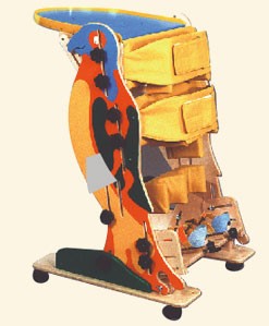 Precyzyjna oraz osobna dla każdej nogi regulacja podparć podkolanowych pozwala na indywidualne podparcie każdej z nóg, dając możliwość płynnego ustawienia zgięcia , jak również odwiedzenia kolan. Umożliwia ona ustawienie optymalnego kąta ugięcia kolan bez przeprostów. W wielu przypadkach staje się narzędziem pozwalającym na stopniową redukcję przykurczów. Przy większych rozmiarach istnieje możliwość łatwego wpinania dziecka. Odchylane podnóżki możemy zapinać dziecku siedzącemu na wózku. Specjalnie wzmocnione , szerokie pasy dają bezpieczne i wygodne przypięcie dziecka, mocno stabilizując miednicę. Wykorzystanie szerokich rzepów ułatwia zapięcie dziecka. Wyjmowane elementy stolika i specjalnie wyprofilowane krążki pozwalają na zamocowanie talerzyka lub miski. Boczne peloty stabilizujące mają możliwość ustawienia zarówno rozstawu jak i kąta. Podpórki biodrowa i piersiowa regulują się każda osobno, w pionie, poziomie i pod kątem, umożliwiając optymalne dopasowanie w przypadku przykurczu biodrowego. Klin regulowany w pionie stanowi dodatkowe zabezpieczenie w przypadku zmęczenia dziecka. Dane techniczne: waga dziecka - do 35 kg; orientacyjny wiek - 3-8 lat; wymiary - 60x60x114cm; max. kąt przykurczu - 120°; wysokość stopy-pachy - 60-88 cm; wzrost dziecka - 85-130 cm; szerokość bioder - do 45 cm; kąt pochylenia parapodium - 50-90°; kąt pronacji supinacji +/- : 15°; kąt ustawienia zgięcia podesz-grzbiet. +/- : 30°; różnica długości nóg - do 20 cm.