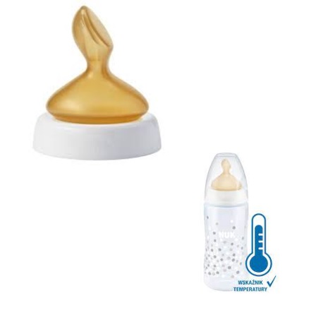 Wielorazowy smoczek specjalistyczny na rozszczep wargi, z nakrętką do butelki standard, z ekologicznego lateksu, z wypustką, zamykającą rozszczep od strony zewnętrznej, ze średnim otworem przepływowym, kompatybilny z gotowymi mieszankami mlecznymi wszystkich firm i butelkami szpitalnymi standard.