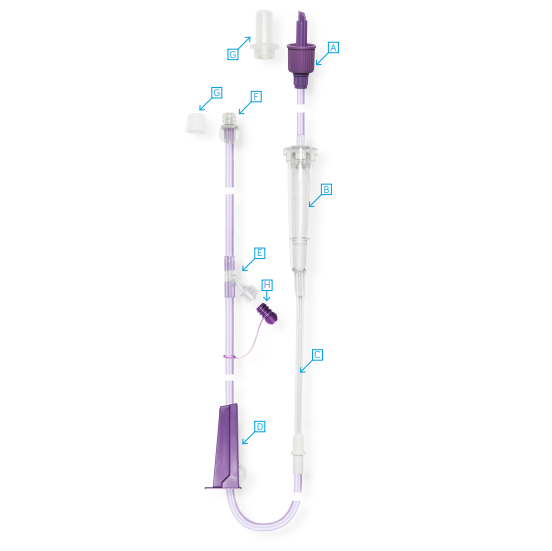 F. Port medyczny ENFit®. Służy do podawania leków i płukania dystalnego odcinka zestawu.
