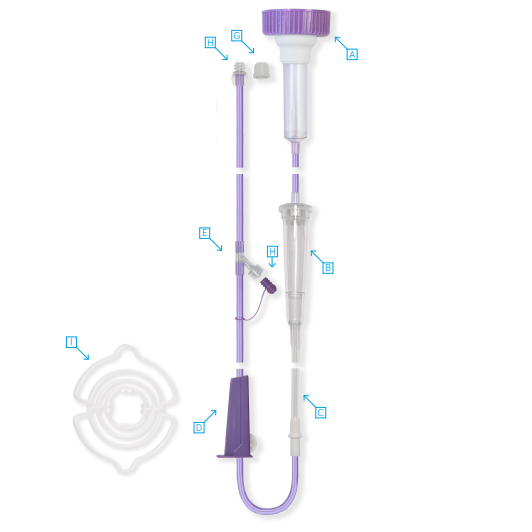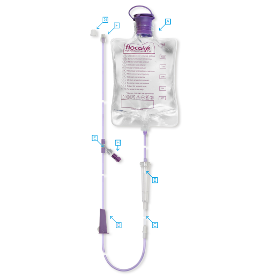 Flocare® Zestaw do pompy Flocare® 800, do butelek, to zestaw do żywienia dojelitowego z końcówką ENFit®, który służy do połączenia butelek z dietą i ze zgłębnikiem. Umożliwia żywienie pacjenta metodą ciągłego wlewu przy użyciu pompy do żywienia dojelitowego Flocare® 800.