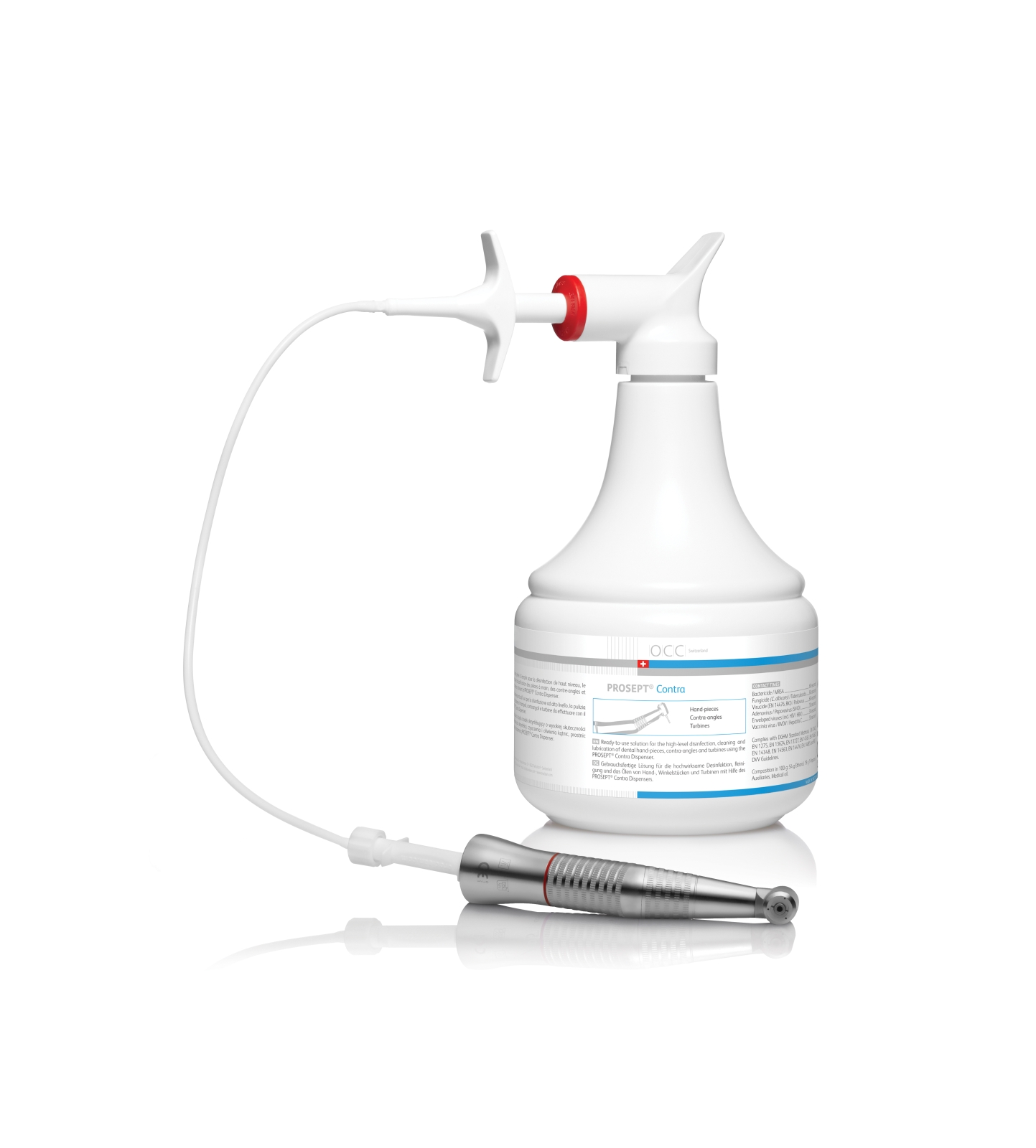 Gotowy do użycia środek dezynfekujący o wysokiej skuteczności do ręcznej konserwacji prostnic, kątnic i turbin. Zestaw zawiera (500ml roztworu, 1 szt. dozownika na butelkę, 3 szt. łącznika).