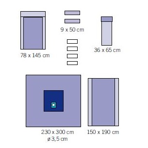- 1 serweta do operacji kończyn 230 x 300cm, elastyczny otwór Ø 7cm z warstwą chłonną 75 x 80cm i organizatorami przewodów