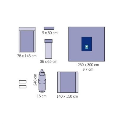 - 1 serweta do artroskopii 230 x 300 cm z elastycznym otworem o średnicy 7cm, z warstwą chłonną i organizatorami przewodów