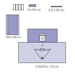 - 1 serweta TUR 175/270 x 170 cm zintegrowana, z osłoną na palec Ø 3 cm, otworem Ø 6 cm i przylepnym otworem Ø 8 cm, z torbą na płyny z filtrem i portem do ssaka