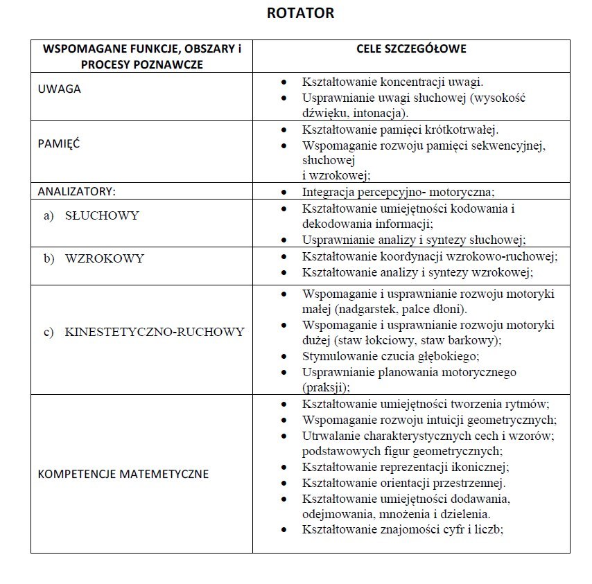 Praca z Rotatorem uzupełnia standardowe zajęcia prowadzone przez specjalistę. Doskonale sprawdza się w ćwiczeniach dysfunkcji grafomotorycznych człowieka. Oddziałuje jednocześnie na wzrok i układ propriocepcji. Obserwuje się duże zaangażowanie dzieci w ćwiczenia prowadzone na Rotatorze. Jak wskazują przeprowadzone przez nas testy, niektóre dzieci z trudnością koncentracji uwagi potrafią pracować z Rotatorem nawet 40 minut.