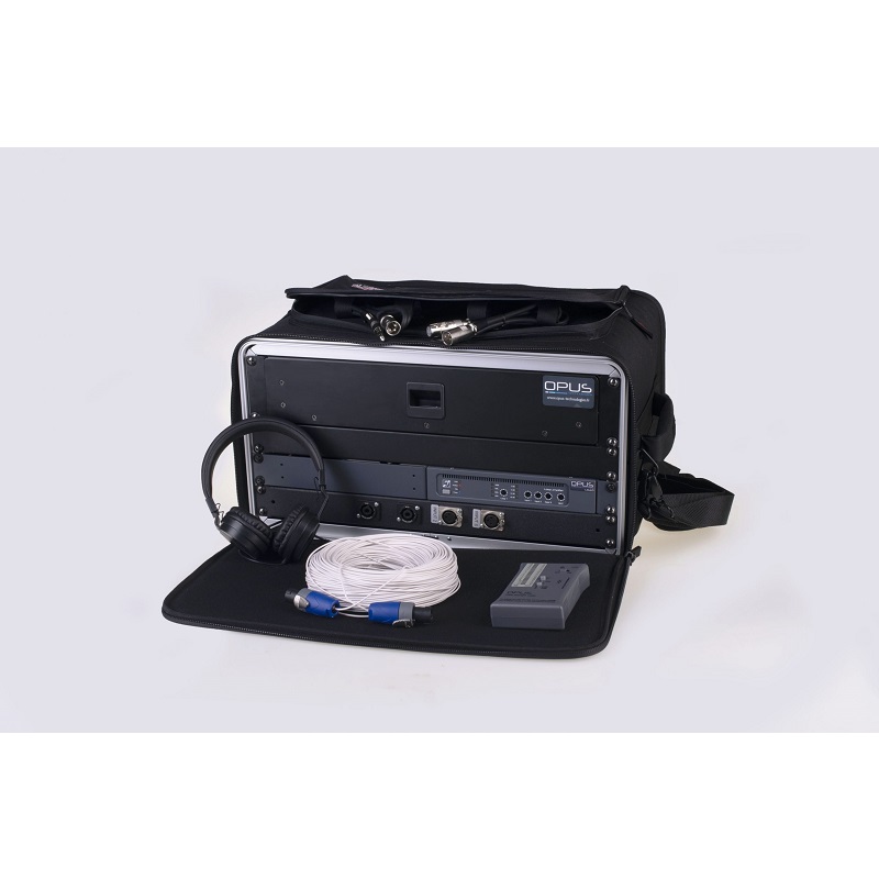 Opus LDP to zestaw zawierający indukcyjny wzmacniacz pętli z rodziny LD(1.0, 2.0, 3.0), 75-metrowy przewód nadystrybutorze, tester pętli OP-FSM-02 z zestawem słuchawkowym, walizka transportowa z kołami/ panel połączeniowy i zestaw przewodów audio.