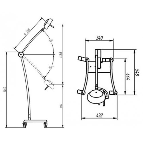Lampa Zabiegowo-Diagnostyczna LED L21-25RE. Lampa została wyposażona w moduł podtrzymania napięcia umożliwiający nieprzerwaną pracę lampy w przypadku przerwy w dostępie energii elektrycznej przez ponad 2 godziny. Mocowanie lampy: lampa na wózku jezdnym, kółka gumowe, 2 kółka z hamulcem (w zestawie). W zestawie rączka do ustawania położenia czaszy.