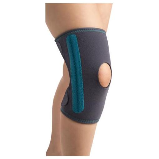 Dziecięcy stabilizator stawu kolanowego wykonany jest z oddychających materiałów od wewnętrznej strony o strukturze plastra miodu, od zewnętrznej strony materiał typu velur (oba materiały elastyczne), po bokach znajdują się elastyczne fiszbiny wspierające i stymulujące więzadła poboczne stawu kolanowego, orteza jest zapinana na taśmy velcro znajdujące się z tyłu uda i podudzia, co pozwala na odpowiednie dopasowanie siły kompresji oraz stabilizacji, w przedniej części otwór na rzepkę zapewnia lepszą stabilizację całego stawu kolanowego.