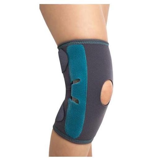 Dziecięcy stabilizator stawu kolanowego wykonany jest z oddychających materiałów od wewnętrznej strony o strukturze plastra miodu, od zewnętrznej strony materiałem typu velur (oba materiały elastyczne), po bokach znajdują się policentryczne szyny wspierające i stymulujące więzadła poboczne stawu kolanowego, zginają się w pełnym zakresie ruchu stawu, orteza jest zapinana na taśmy velcro znajdujące się z tyłu uda i podudzia, co pozwala na odpowiednie dopasowanie siły kompresji oraz stabilizacji, w przedniej części otwór na rzepkę zapewnia lepszą stabilizację całego stawu kolanowego.