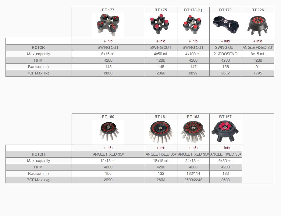 - Dostępne wirnik kątowe : 8 x 15 ml; 18 x 15 ml; 24 x 15/10/7 ml; 6 x 50 ml; 32 x 15/10/7 ml