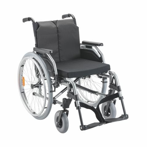 START M2S to lekki wózek wykonany z aluminium. Standardowo wyposażony w czarną nylonową tapicerkę siedziska i oparcia. Kolor ramy - srebrny. Do wyboru szerokość siedziska: