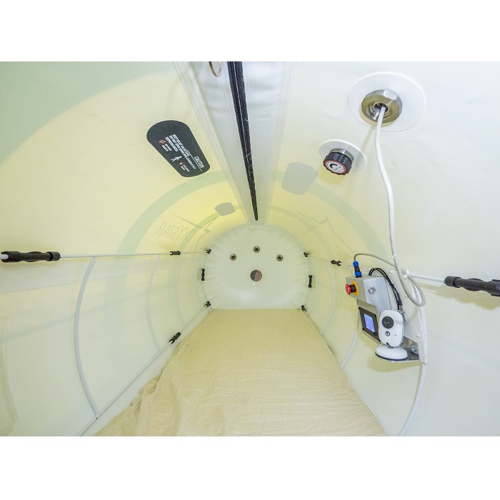 prosta obsługa sterownika to atuty tego rozwiązania. System dodatkowo wyposażony jest m.in. w generator wodoru gazowego, wydajną i cichą sprężarkę, profesjonalny koncentrator tlenu o wydajności 10 l/min, system chłodzenia i osuszania powietrza, wbudowany ozonator to dezynfekcji wnętrza komory po seansie oraz butlę CO2 z reduktorem dla szybszego osiągnięcia optymalnej atmosfery w komorze.
