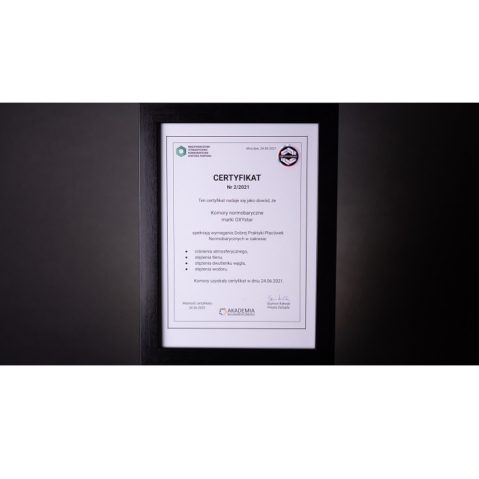 Komory OXYstar posiadają certyfikat Międzynarodowego Stowarzyszenia Normobarii potwierdzający spełnienie wszystkich wymagań sformułowanych w Dobrej Praktyce Normobarycznej odnośnie ciśnienia atmosferycznego oraz stężeń tlenu, dwutlenku węgla i wodoru. Korzystając z nich można więc być pewnym, że warunki panujące wewnątrz są zgodne z założeniami opracowanymi przez twórcę normobarii - Doktora Jana Pokrywkę.