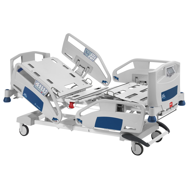 - Elektryczne funkcje łóżka regulowane przy użyciu sterowania wbudowanego w barierki boczne oraz dotykowego ekranu LCD zintegrowanego w szczycie od strony nóg pacjenta przeznaczonego dla personelu