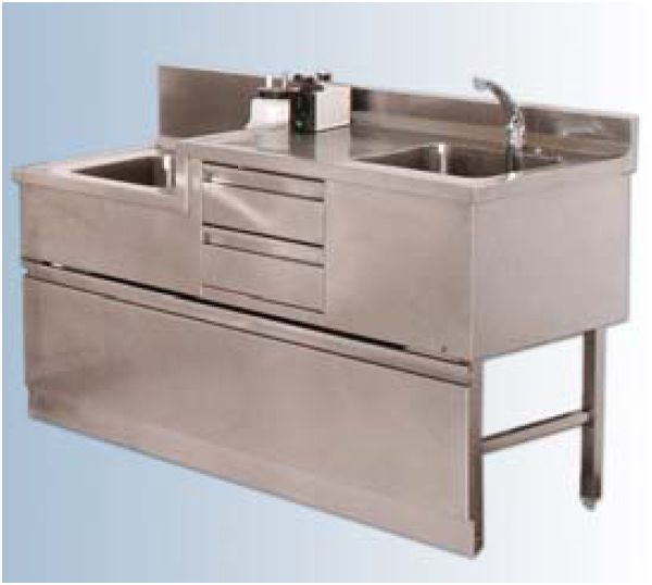 Zlew prosektoryjny Privilege wyposażony jest w 3 szuflady. 2 z nich mają wyjmowane kuwety wykonane ze stali kwasoodpornej. Pierwszy zbiornik zaprojektowany na narzędzie. Drugi wyposażony w kółka. Powierzchnia robocza wyposażona w krawędzie zapobiegające rozlaniu.
