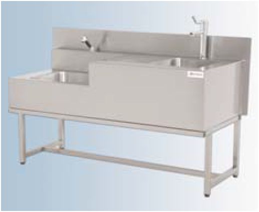 Zlew prosektoryjny Standard. Pierwszy zbiornik zaprojektowany na narzędzie. Drugi wyposażony w kółka. Powierzchnia robocza wyposażona w krawędzie zapobiegające rozlaniu.