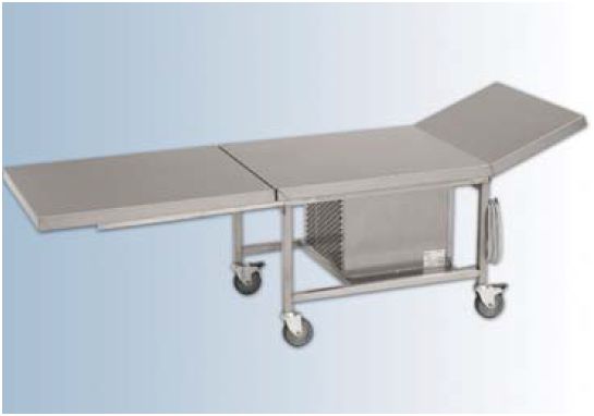 Blat wykonany ze stali kwasoodpornej INOX 304L. Składa się z 2 części: 1) Element uniesiony przy głowie wykonany z: Izolacji: pianki poliuretanowej. Chłodzenie doprowadzone za pomocą serpentynowej rurki miedzianej. 2) Element płaski przy nogach składany na zawiasach z inox'u. Konstrukcja: profile stalowe 25x25 mm. Cztery kółka, z których 2 posiadają hamulce (średnica kółka 100 mm). Koła osadzone na stalowych trzpieniach. Wysuwana teleskopowo część podpierająca nogi.