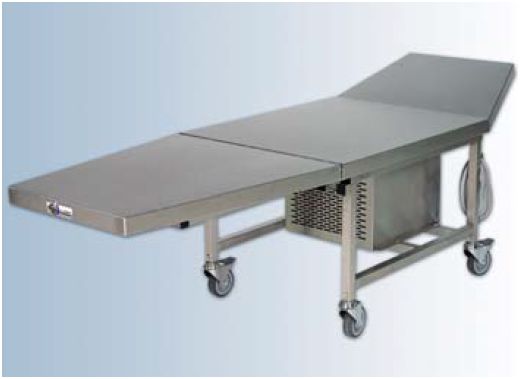 Stół chłodzony do prezentacji zwłok z odprowadzeniem skroplin. Odróżnia się od pozostałych, bo wyposażony jest w specjalny zbiornik na skropliny. Blat wykonany ze stali kwasoodpornej INOX 304L. Składa się z 2 części: 1) Element uniesiony przy głowie wykonany z: Izolacji: pianki poliuretanowej. Chłodzenie doprowadzone za pomocą serpentynowej rurki miedzianej. 2) Element płaski przy nogach składany na zawiasach z inox'u. Konstrukcja: profile stalowe 25x25 mm. Cztery kółka, z których 2 posiadają hamulce (średnica kółka 100 mm). Koła osadzone na stalowych trzpieniach. Wysuwana teleskopowo część podpierająca nogi.