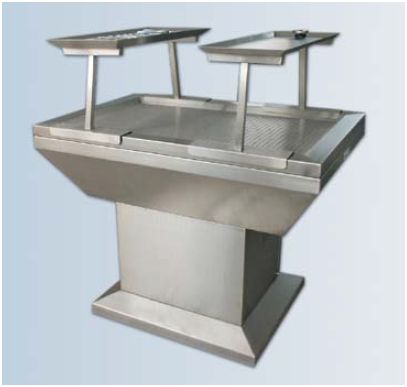 Stół do selekcjonowania narządów jest ustawiony w pozycji litery L w stosunku do sekcyjnego wentylowanego. Wyposażony w system wentylacji usuwający odory i szkodliwe opary z powierzchni roboczej. Może być podłączony do centralnej wentylacji lub opcjonalnej stacji wentylacji. Blat roboczy ze stali kwasoodpornej może być wyposażony w płytę do selekcjonowania pobranego materiału. Duża stabilność. Dzięki centralnej nodze łatwy dostęp do pola pracy.