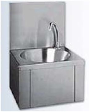 Umywalka do rąk ze ścianką na rozpryski, wyposażona w elastyczny wężyk, syfon, kran na "łabędziej szyi" 1/2", bateria wody zimnej/gorącej. Zawór zwrotny. Okrągła misa. Przepływ 6l/min. Uruchamiana kolanem. Wysokość ścianki: 240 mm.