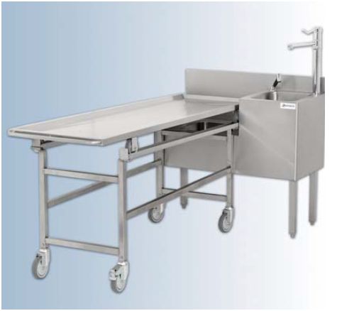Lekki i zajmujący mało miejsca wózek służy do przygotowywania lub prezentacji ciała. Konstrukcja ze stali kwasoodpornej 304. Szyny posiadają zabezpieczenia przed spadnięciem tacy. Wyposażony w 4 kółka, dwa z nich mają hamulce.
