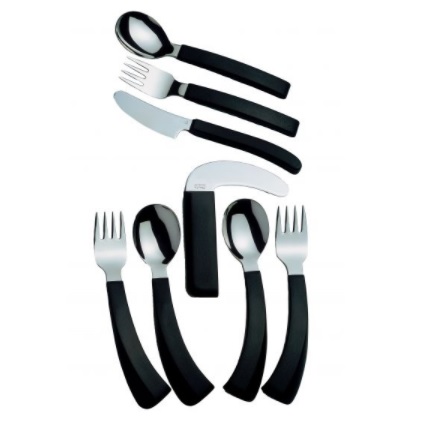 Sztućce zgięte są dostępne zarówno dla osób praworęcznych jak i leworęcznych. Nóż posiada prosty uchwyt z zakrzywionym ostrzem, które umożliwia cięcie pod kątem. Widelce i łyżki mają zakrzywione uchwyty co sprawia, że są łatwe do uchwycenia i wymagają tylko małych ruchów nadgarstka. Produkty ze stali nierdzewnej są łatwe do czyszczenia i nadają się do mycia w zmywarce.