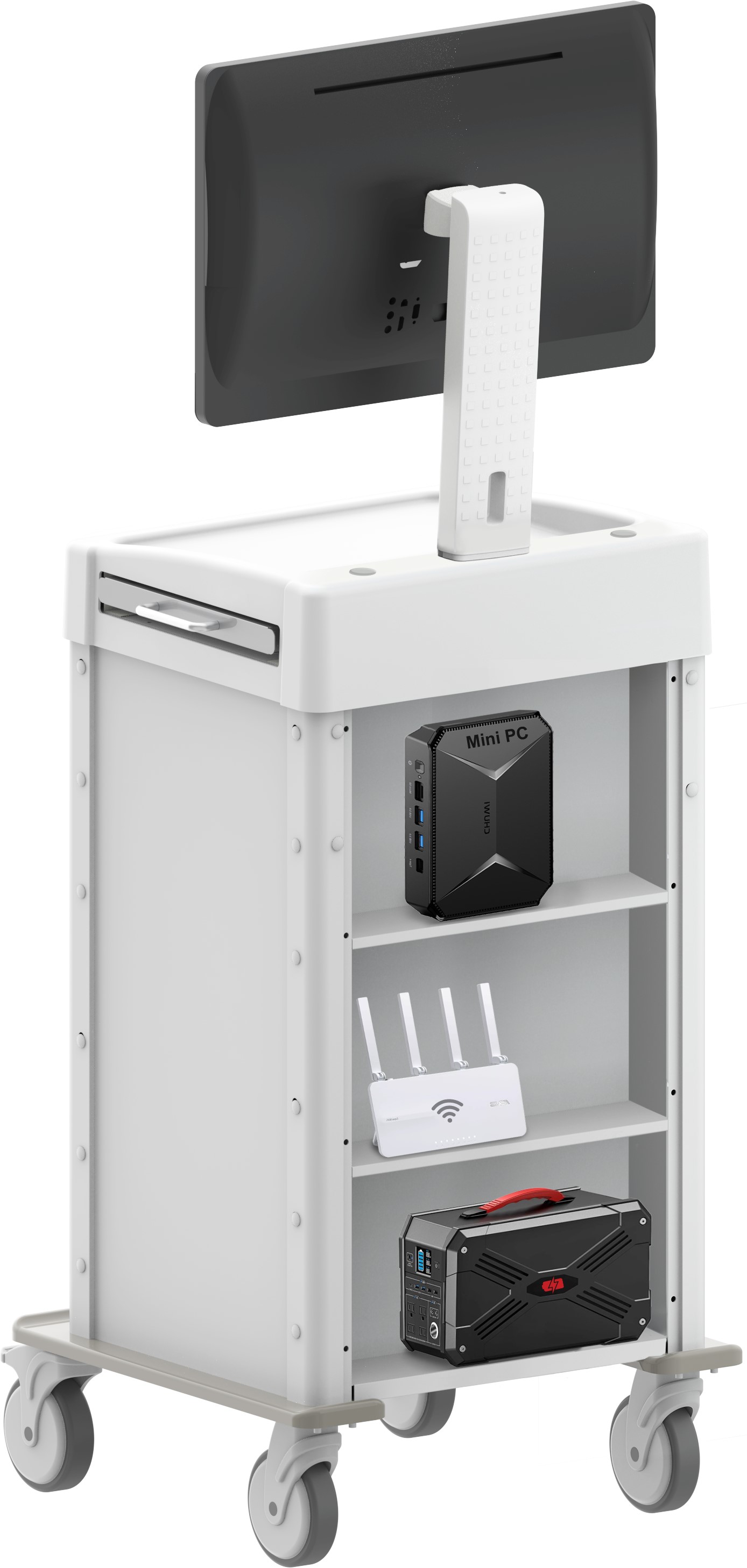 Wielofunkcyjna tylna przestrzeń wózka może służyć jako schowek, bezpieczne miejsce do przechowywania cennego sprzętu IT lub dodatkowe miejsce na akcesoria do wózka.
