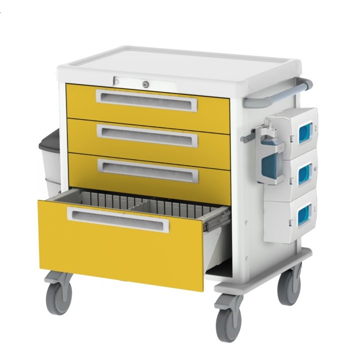 Plus - Wózek ma zazwyczaj 4-5 szuflad i jest wyposażony w: zamek na klucz, blat roboczy, uchwyt do pchania, kosz na śmieci wraz ze wspornikiem szyny DIN i pojemnikiem na odpady. Wózek można szybko i łatwo zdezynfekować przy użyciu standardowych protokołów i środków dezynfekujących.